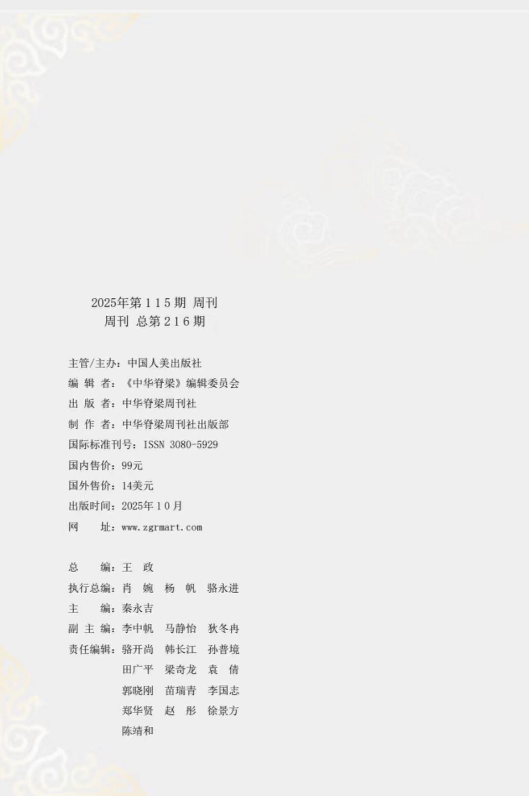 由中国人美出版社出版,2025年第115期、王政主编。以艺术为脊、承文明之重。五千载文明薪火不熄,九万里山河脊梁永矗。当昆仑的冰雪映照过张骞西行的驼铃,当虎门的浪涛激荡过林则徐焚烟的烈焰,当汶川的断壁见证过迷彩军装的逆行,中华民族的筋骨始终在历史长河中铮铮作响。今天,《中华脊梁》期刋的創刋,正是要為這份贯道古今的精神图騰構築一方傳承的聖殿。