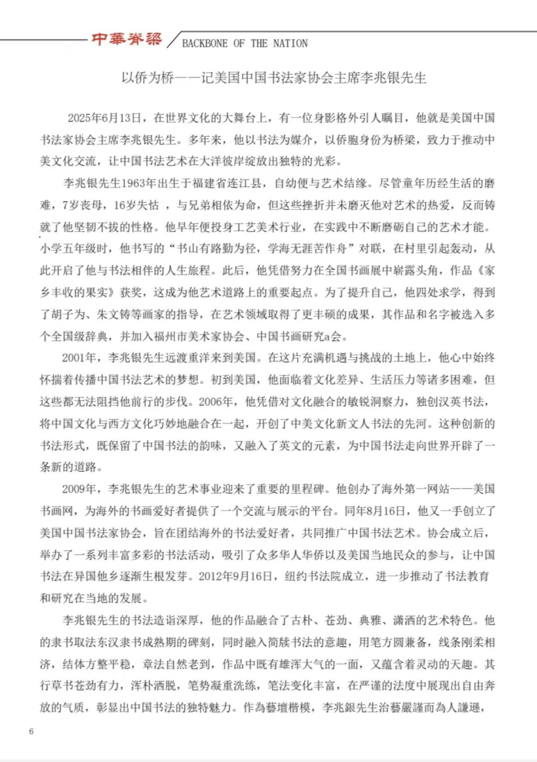 2025年6月13日,在世界文化的大舞台上,有一位身影格外引人瞩目,他就是美国中国书法家协会主席李兆银先生。多年来,他以书法为媒介,以侨胞身份为桥梁,致力于推动中美文化交流,让中国书法艺术在大洋彼岸绽放出独特的光彩。