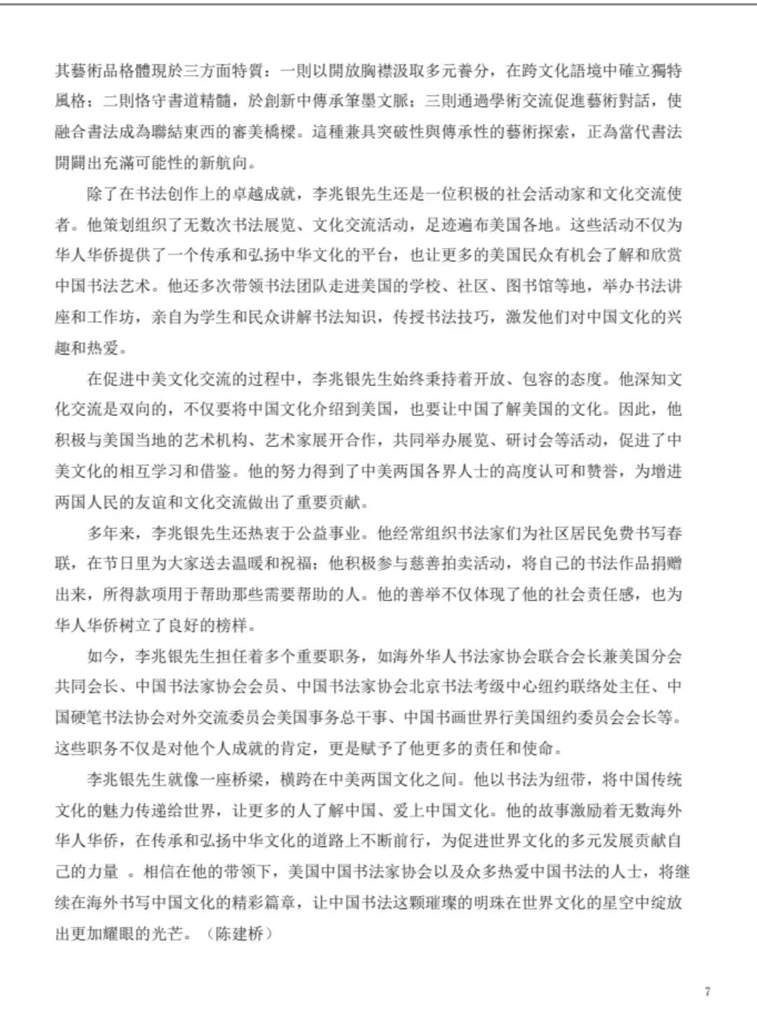 李兆银先生就像一座桥梁,横跨在中美两国文化之间。他以书法为纽带,将中国传统文化的魅力传递给世界,让更多的人了解中国、爱上中国文化。他的故事激励着无数海外华人华侨,在传承和弘扬中华文化的道路上不断前行,为促进世界文化的多元发展贡献自己的力量 。相信在他的带领下,美国中国书法家协会以及众多热爱中国书法的人士,将继续在海外书写中国文化的精彩篇章,让中国书法这颗璀璨的明珠在世界文化的星空中绽放出更加耀眼的光芒。(陈建桥)
