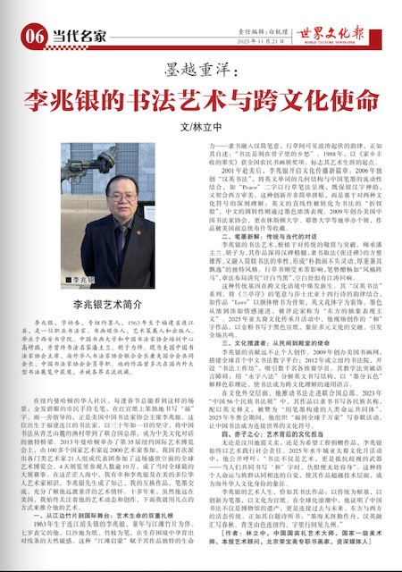 李兆银的艺术人生,恰如其书法作品:以传统为根基,以创新为笔墨,以文化为宣纸。在全球化浪潮中,他证明了中国书法不仅是博物馆的遗产,更是连接过去与未来、东方与西方的活态传统。正如其自题诗所书:“墨海无涯勤作舟,汉英融汇写春秋。青芝山色连纽约,字里行间见九州。”(林口立中)