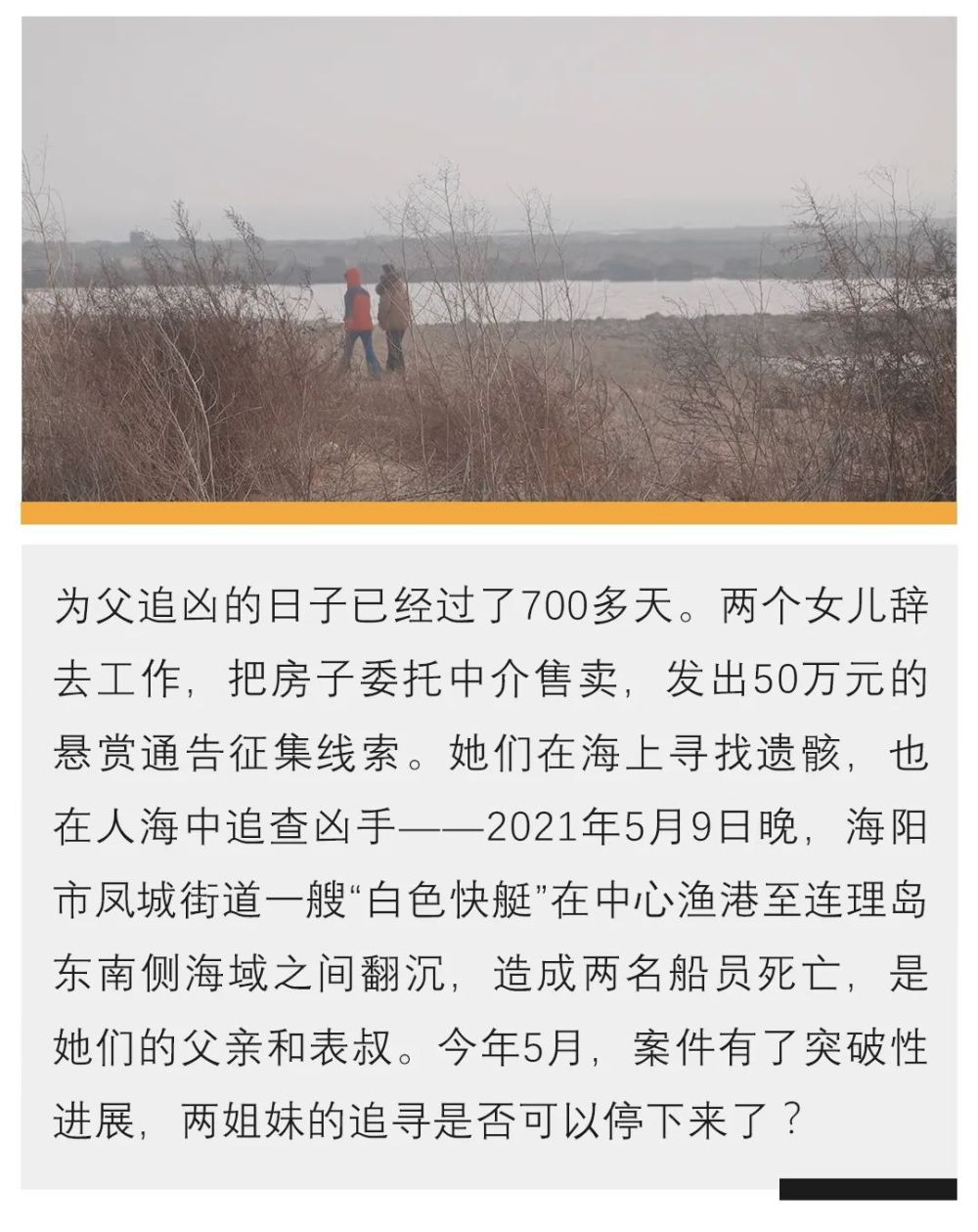 那次的循环周期长达4个月。两姐妹给“知情人”送了几万块钱和东西,拿到一点线索就四处奔走。直到警方发现所谓的“知情人”,案发当天根本没到过海阳海域,更不可能见过肇事船。后来他承认,从头到尾都是编的,就想骗点钱。