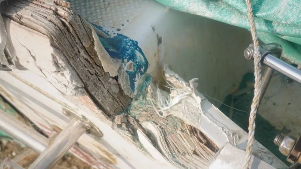 ●父亲快艇上,肇事船留下的红蓝船漆,后被警方切走取样调查。