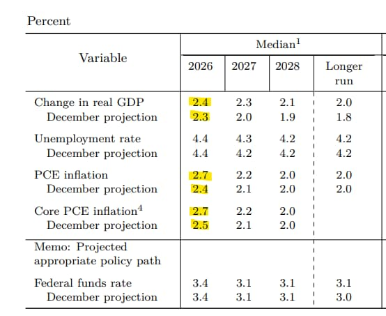 美联储发布了季度经济预测,最大的变化在于其2%通胀目标缺乏进展。FOMC成员的预测中值目前预计今年PCE通胀率为2.7%(12月时的预测为2.4%),并将2027年的PCE小幅上调至2.2%(此前为2.1%)。