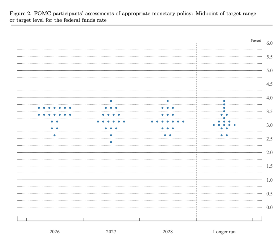 至于备受瞩目的利率预测“点阵图”,最鸽派的成员也回归了共识——去年12月接近2%的预测点消失了,而此前徘徊在2.5%-2.75%附近的预测点则上移至3%-3.125%附近(每一个点都代表一位投票委员对利率的看法)。总体而言,利率预测范围缩小,表明委员会已趋于采取更为渐进、幅度较小的降息路径。