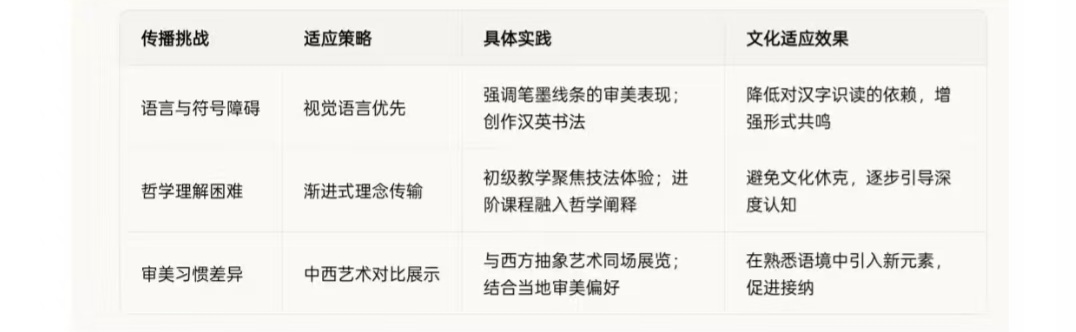 当前书法国际传播仍面临文化差异大、专业人才不足、 传播碎片化等挑战。未来可从以下方面改进: