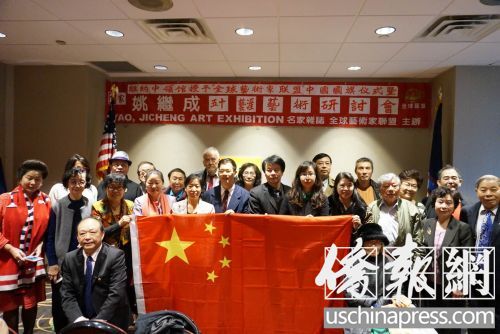 授旗仪式上嘉宾合影。(美国《侨报》/陈辰 摄) 中国侨网12月30日电 据美国《侨报》报道,中国驻纽约总领馆授予全球艺术家联盟国旗仪式暨姚继成艺术生涯五十周年研讨会29日在纽约法拉盛举行。