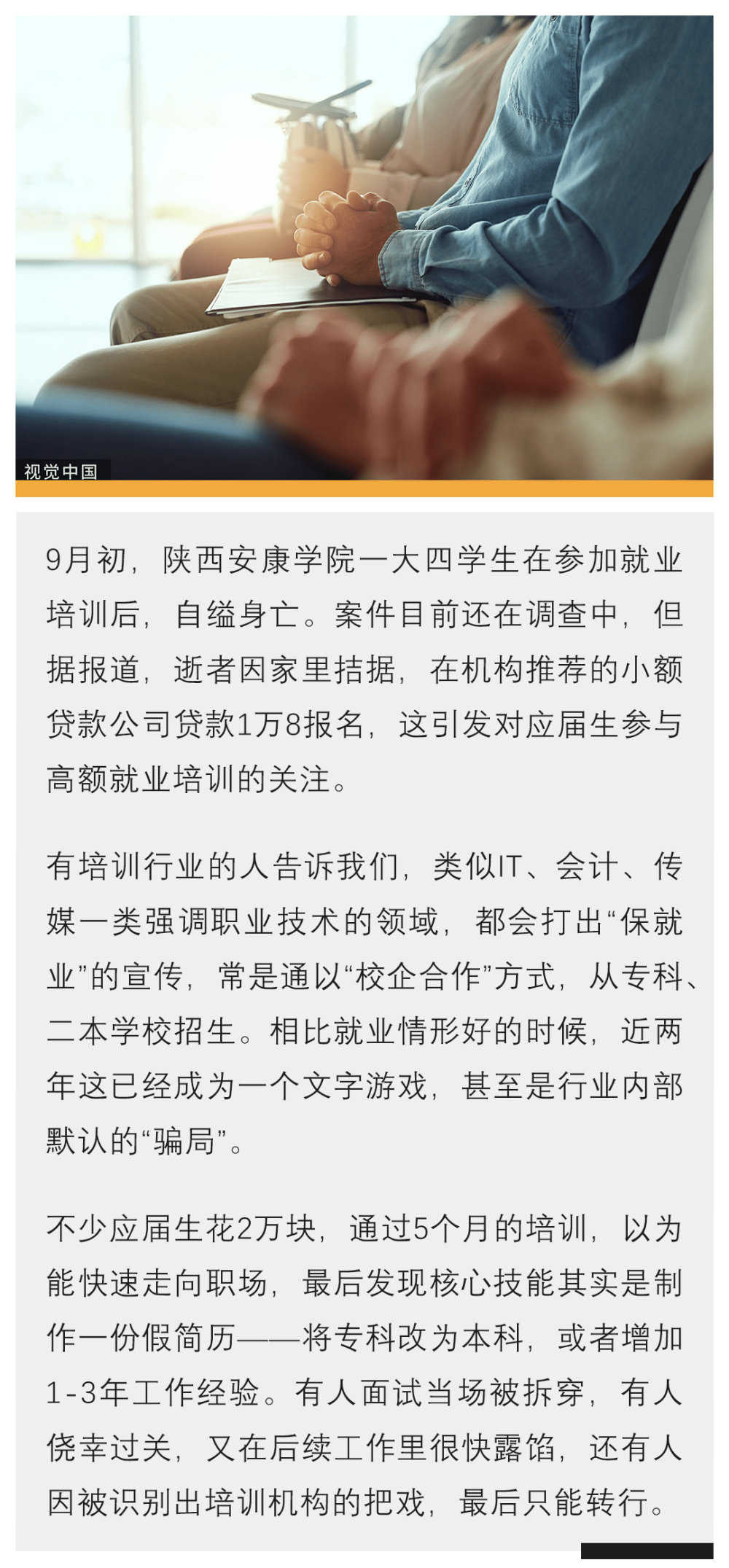 “千锋教育、中公教育的‘优就业’,都是IT培训行业比较有名的机构,有的还属于上市公司。”汪翰称,在2016、2017年就业行情好的时候,一个培训班的就业率达到90%不是难事,几个没找到工作的学员,机构也会退费。然而在今年,培训机构宣称自己能“保就业”,或展示100%的就业率,更多是一种文字游戏。