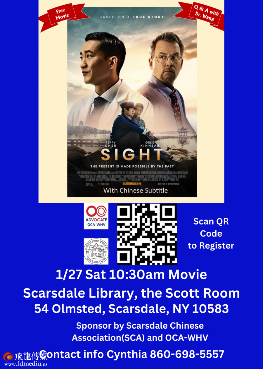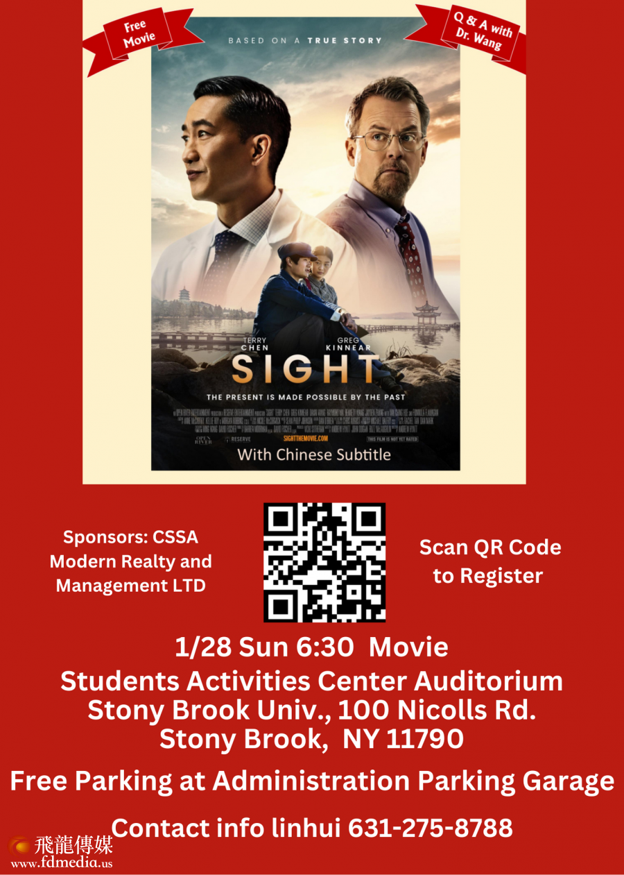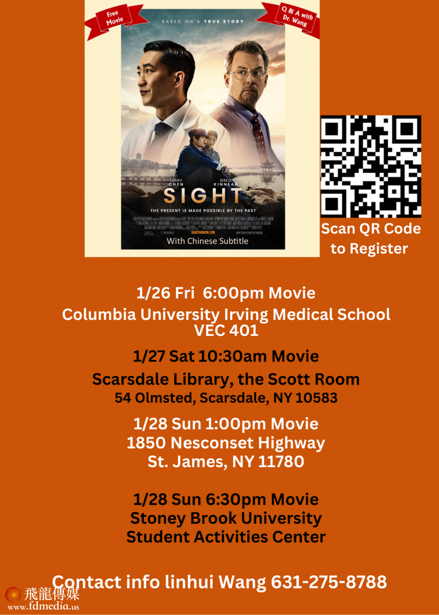 全美最热人物王明旭医生和好萊塢获獎大片Sight电影义演即将到纽约举办观影活动1/26–1/28