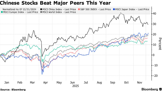 在一个股市表现亮眼的年度,中国已重新赢回全球资金的青睐。投资者预期,凭借其在人工智能领域的实力以及在贸易环境中的韧性,中国市场将带来进一步回报。