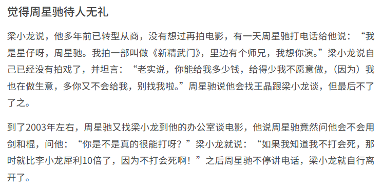 也提到《新精武门》的邀请,梁小龙说谈到报酬时周星驰说会找王晶跟他谈,但最后不了了之