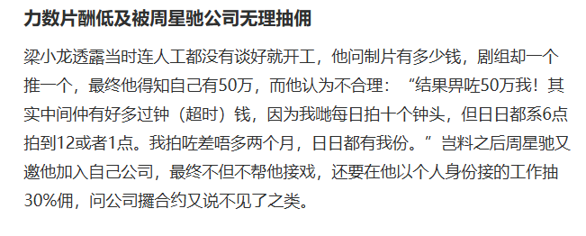 到2012年,梁小龙才提到,自己和星辉公司签约一年就解约,控诉星爷以“海鲜价”吃回扣。