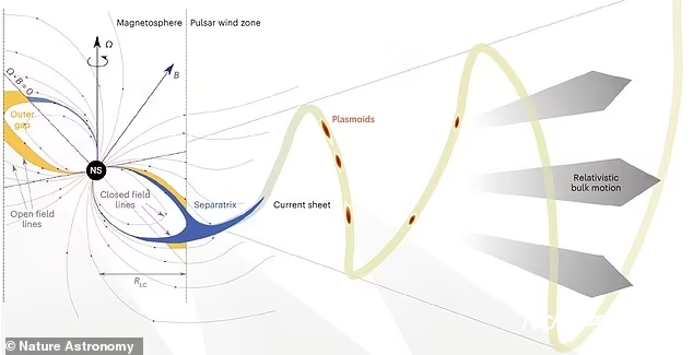 与包括地球在内的行星一样,脉冲星也有一个磁层,这是一个无形的力场,可以将粒子喷流沿两个磁极送出。