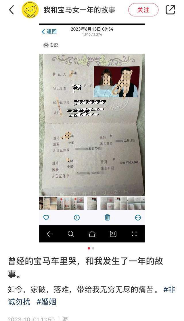 北京时间2023年10月4日,有人通过社媒晒出了马诺与她丈夫的结婚证。在这张生图里可以看到,马诺的丈夫还用“家破”与“落难”等词语来形容自己的生活。