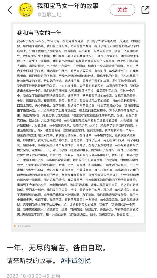 据长文显示,马诺与她的丈夫在2022年7月认识于直播间。当时他给马诺刷了20多万的礼物,然后双方就聊了起来,后来越来越熟,直到在上海见面。