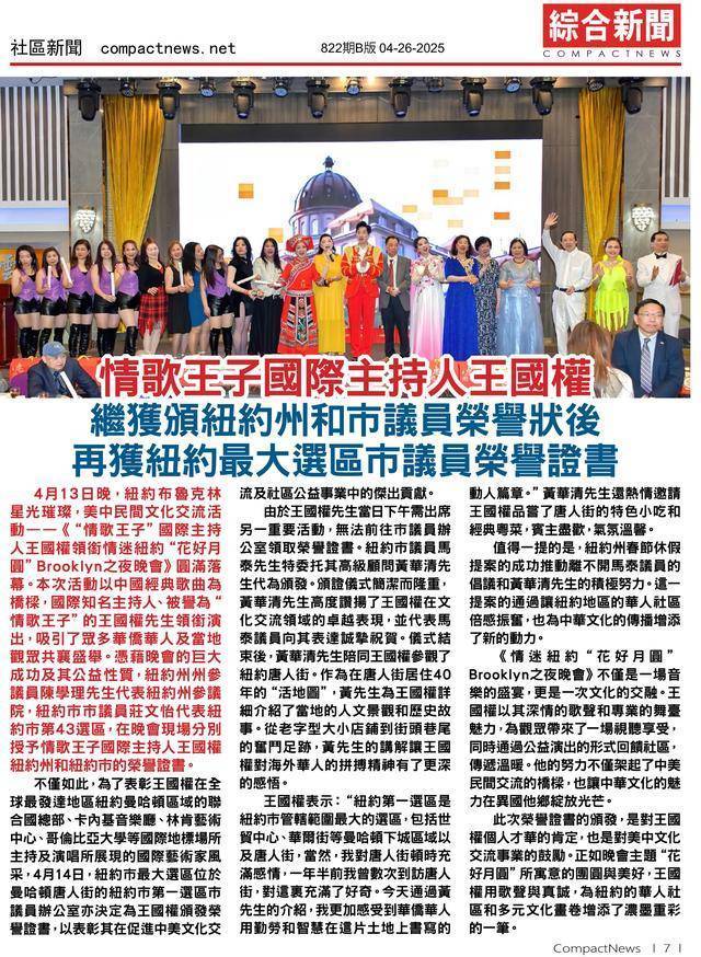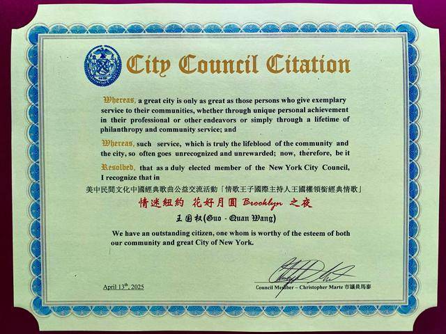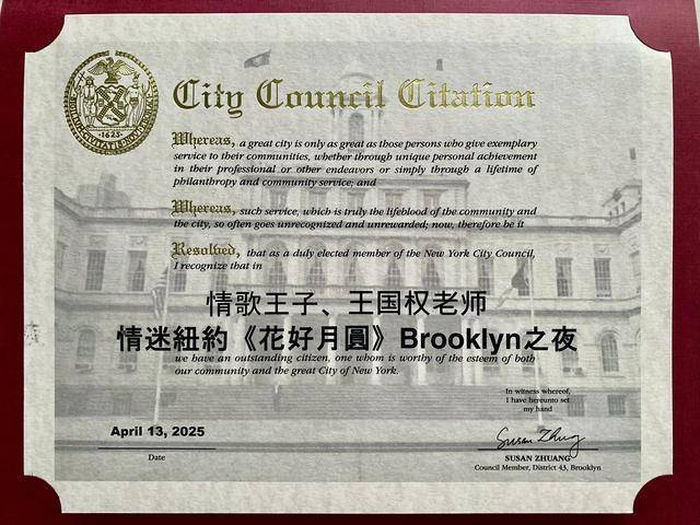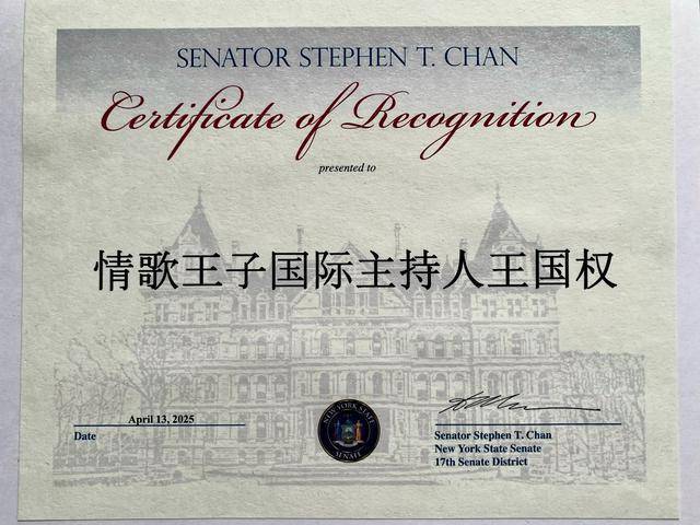 “情歌王子”国际主持人王国权三度获美国议员殊荣|彰显中美文化交流新篇章