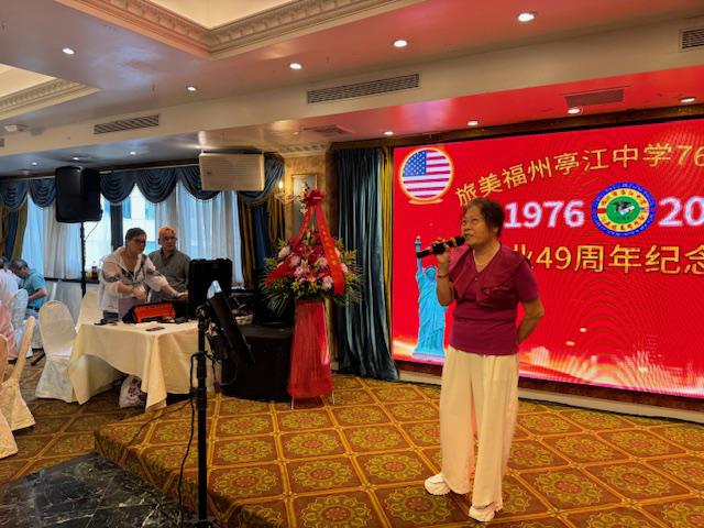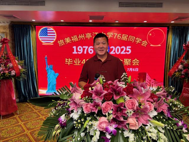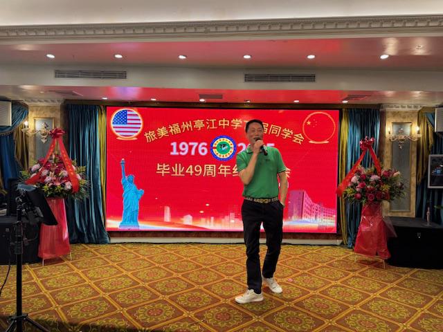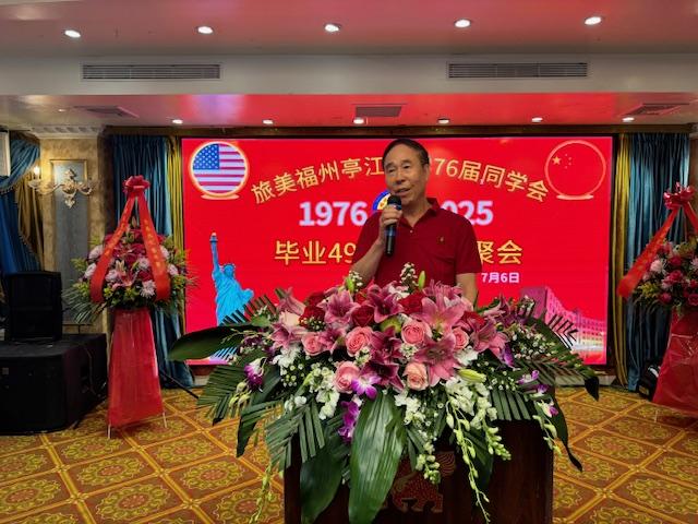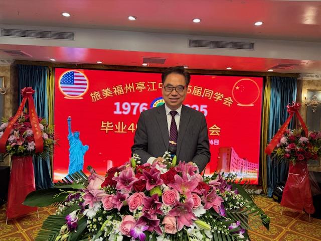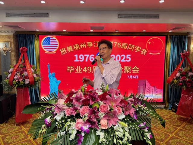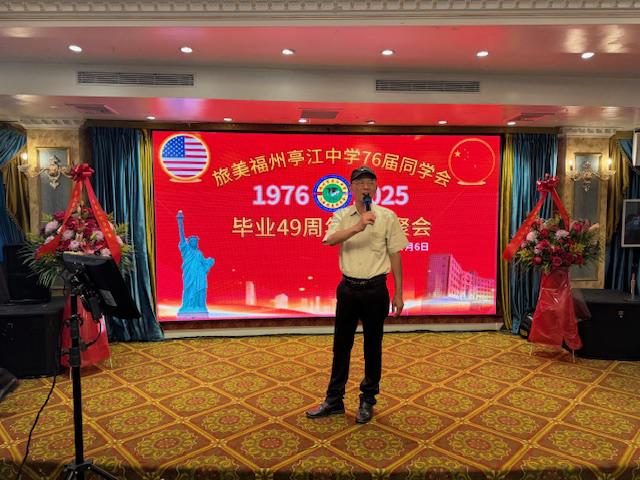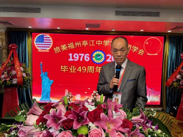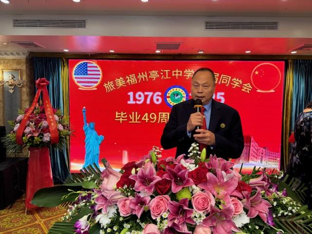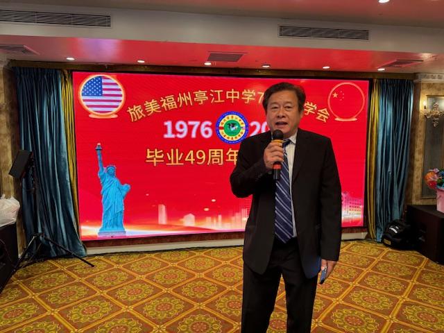 旅美福州亭江中学校友总会创会主席郑思祺致词:今天能受邀参加旅美福州亭江中学76届同学会一年一度的庆典活动,我感到非常荣幸。作为校友总会的一员,我始终深信:无论哪一届,母校情、同窗谊,都是我们共同的精神财富。
