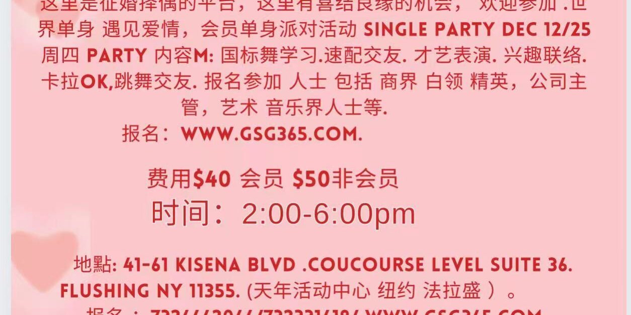 这里是征婚择偶的平台,这里有喜结良缘的机会,请到这里寻觅爱情,有颗心在这里呼唤你! 欢迎世界各地单身男女踊跃参加,在此偶遇佳緣,传递爱情友情,让幸福赐給单身派对有緣人! 机会甚佳,成功等待所有会员!Single party Dec 12/25 Thur.2:00–6:00pm. Party 内容: 国标舞学习.烛光晚餐. 速配交友. 才艺表演. 兴趣联络. 卡拉ok,跳舞交友. 报名参加 人士 包括 商界 白领 精英,公司主管,艺术 音乐界人士等等,活动详细报名见公司网站 :世界单身联谊会 。 详细信息请上公司网站注册:www.gsg365.com. 此次活动詳細地點:41 -61 Kisena Blvd Coucourse Leve suite 36 Flushing NY 11355(天年活动中心) 联系电話:7323316189/9177052606. 歡迎 报名参加等等,活动详细报名见公司网站 :世界单身联谊 详细信息。 公司不仅有线上交友平台,也提供线下高端婚恋交友服务平台。公司成立十多年来,集聚了大批涵盖各个年龄层的高学历、高收入、高素质的白领人士,行业精英。我们相信:加入世界单身联谊会,一定能够邦助你告别单身。圆你心中的梦。