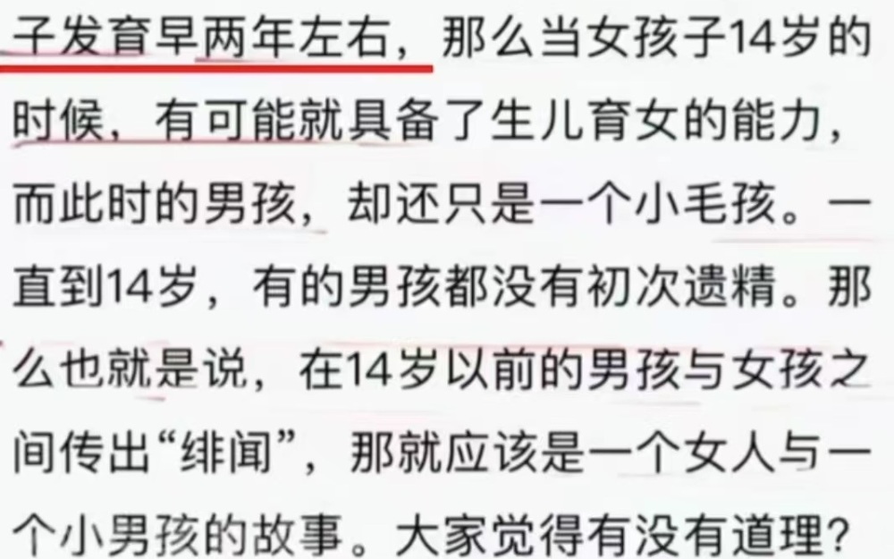 《班主任修炼之道》第三章“班主任专业化的首要前提”提到,“女孩子比男孩子发育早两年左右,那么当女孩子14岁的时候,有可能就具备了生儿育女的能力,而此时的男孩,却还只是一个小毛孩。一直到14岁,有的男孩都没有初次遗精。那么也就是说,在14岁以前的男孩与女孩之间传出‘绯闻’,那就应该是一个女人与一个小男孩的故事。”书中还提到,“我们说句不好听的话,一旦有所谓的‘早恋’,女孩应该是主要的责任人,她们暗示或勾引的居多。”