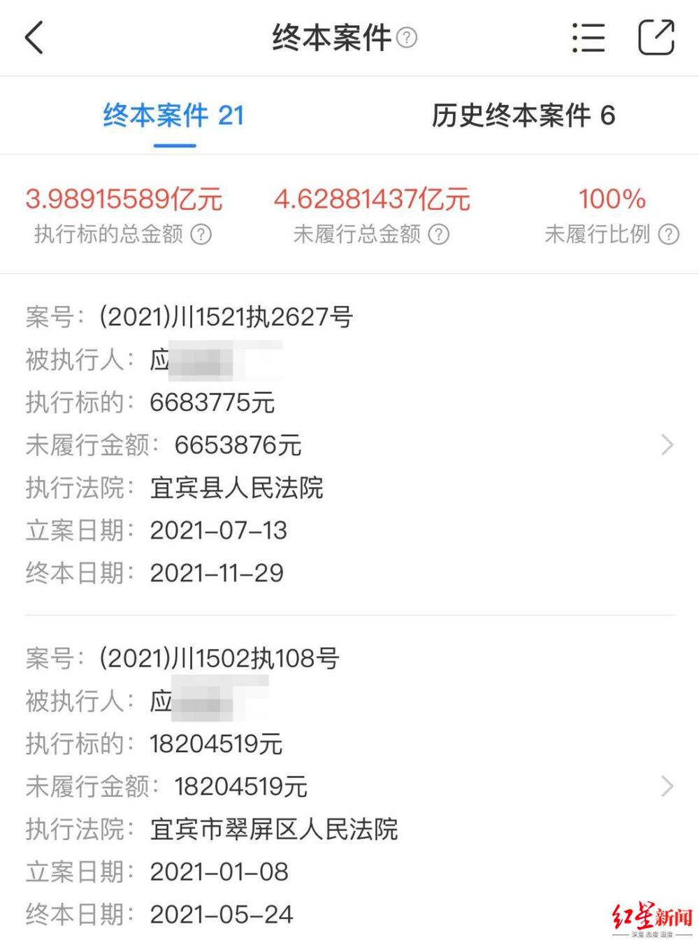 据统计,除成都中院、青羊法院3起案件本息共计1.7亿欠款外,其在宜宾老家、内江、成都等地还涉及多起借款纠纷,总计未履行金额已超4亿。