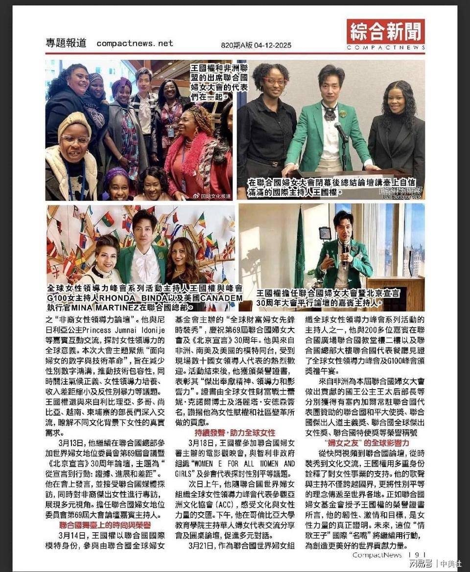 纽约《综合新闻》(2025年4月12日,第820期)称其表演延续了1945年顾维钧签署《联合国宪章》的荣光,为活动注入跨文化神韵。