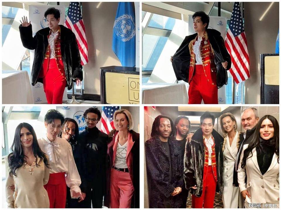 他身着中西合璧的时装,以及貂皮大衣,以独特的东方美学舞台魅力吸引了来自50多国的女部长、外交官及联合国人道主义大使等嘉宾,被誉为“才华横溢、风华绝代的东方绅士”(《侨报》)。