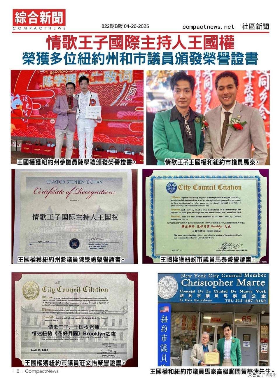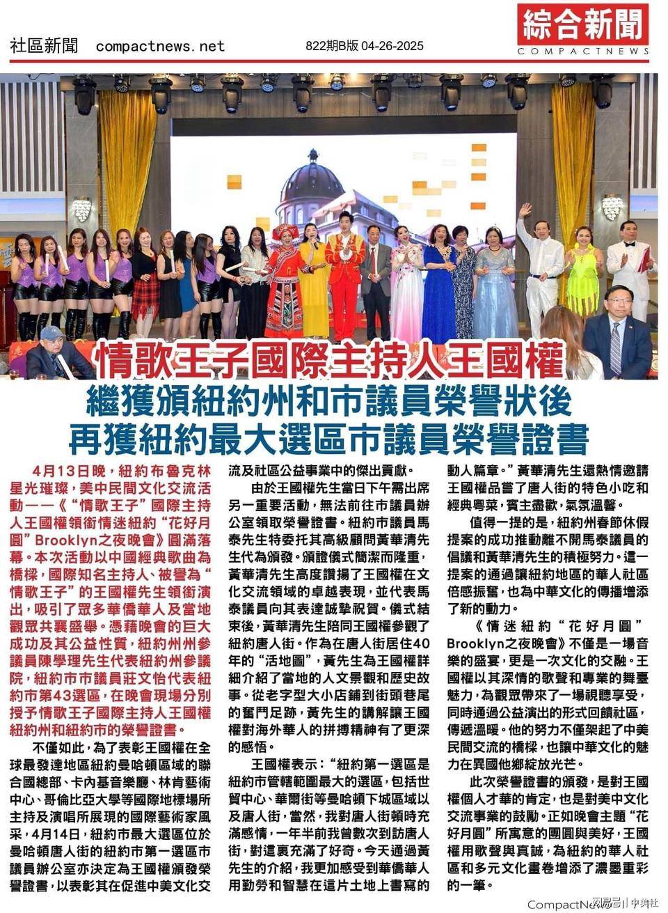 王国权以联合国、哥大、林肯中心等地标的双语主持与情歌演绎,铸就全球文化光辉,实至名归“著名国际主持人”之誉。
