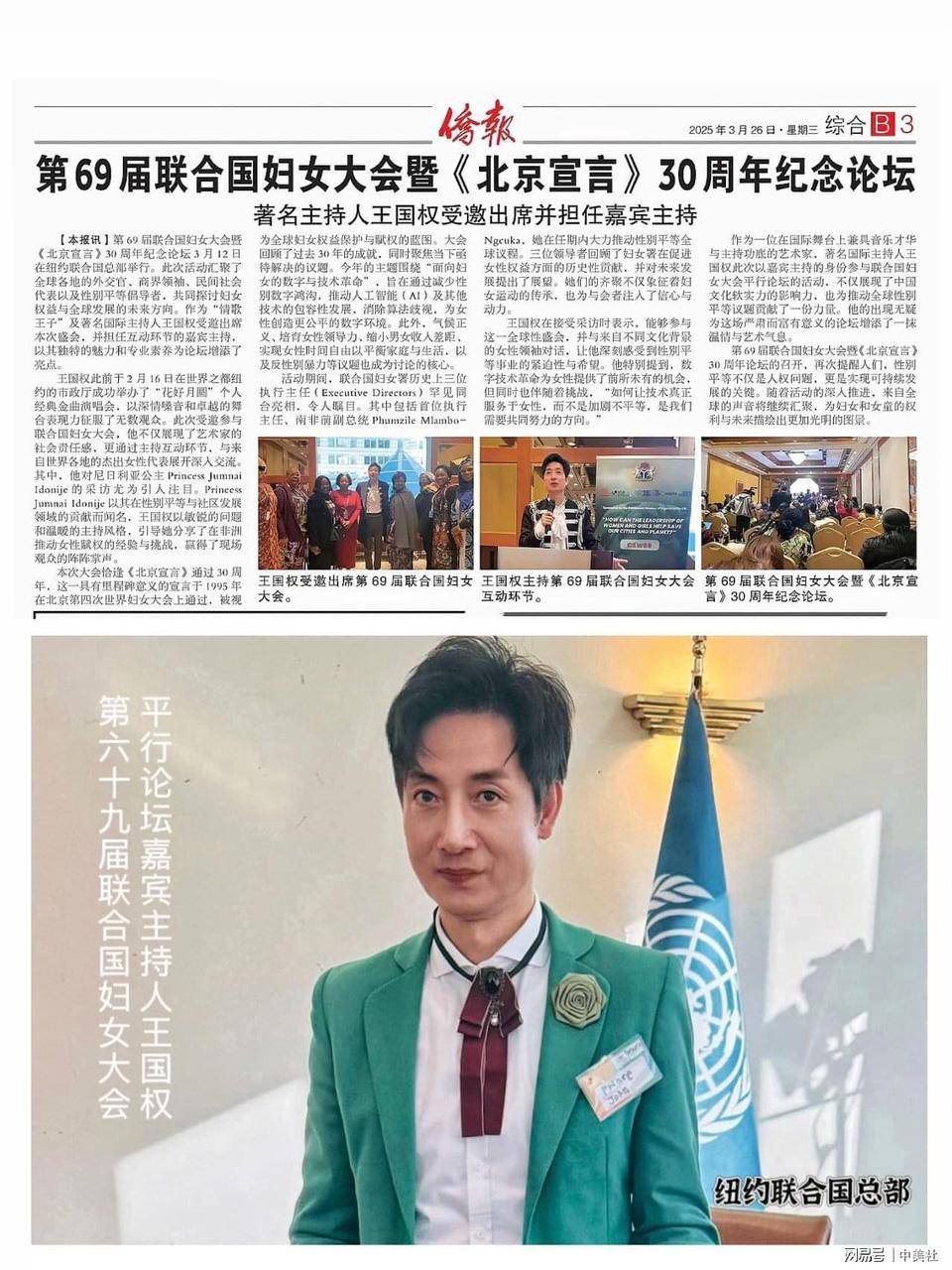 Celebrated as the “Love Song Prince” and “International Friend of Women,” Wang Guoquan, during the 69th UN Commission on the Status of Women (CSW69) in 2025, showcased the profound integration of Chinese culture with global governance through exceptional bilingual hosting and timeless love song performances at landmarks like the UN Headquarters, Columbia University, and Lincoln Center, establishing his eminence as an international host, truly deserving the title. title.
