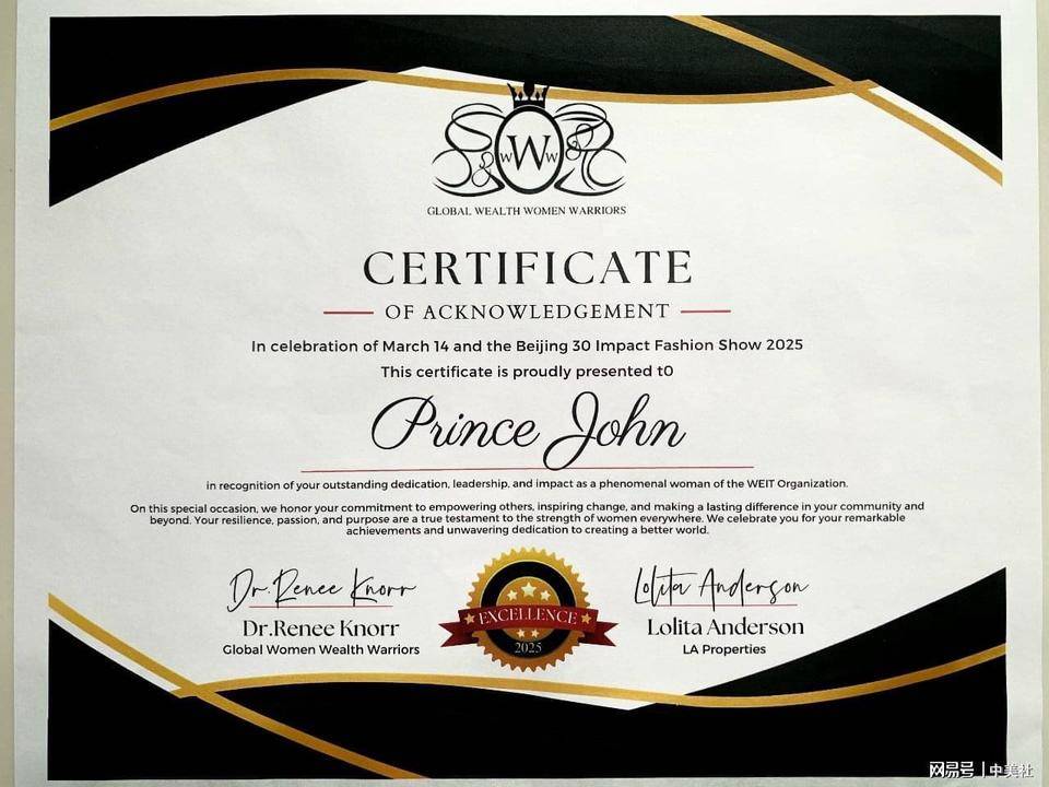 联合国WEIT组织颁发荣誉证书,颂其“韧性、激情与全球影响力”,由蕾妮·克诺尔博士和洛丽塔·安德森亲笔签名。