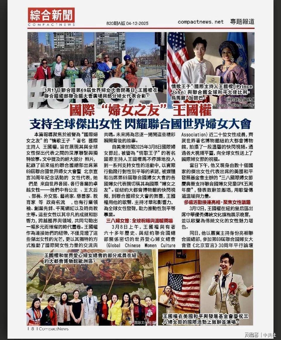王国权(Prince John),被誉为“情歌王子”和“国际妇女之友”,在2025年第69届联合国妇女地位委员会会议(CSW69)期间,以卓越的双语主持和经典情歌演绎,于联合国总部、纽约市政厅、哥伦比亚大学、林肯中心等地标主持高端盛会,展现了中国文化与全球治理的深度交融,奠定其国际主持界翘楚地位,实至名归。