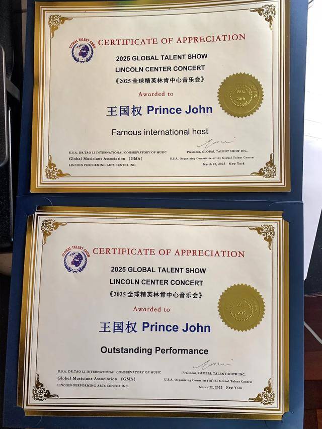 纽约,林肯中心——2025年,一场名为“全球精英”的音乐会在世界艺术殿堂林肯中心盛大举行。这场音乐会以其丰富多样的表演形式和深厚的文化内涵,吸引了众多观众的目光,成为中美音乐文化交流的重要里程碑。来自中国上海的著名国际双语主持人、“情歌王子”王国权以其温润如玉的嗓音、儒雅的主持风格和深情演唱,赢得全场热烈掌声,并荣获主办方颁发的“Famous International Host”著名国际主持人荣誉证书和“Outstanding Performance”杰出表演荣誉证书。