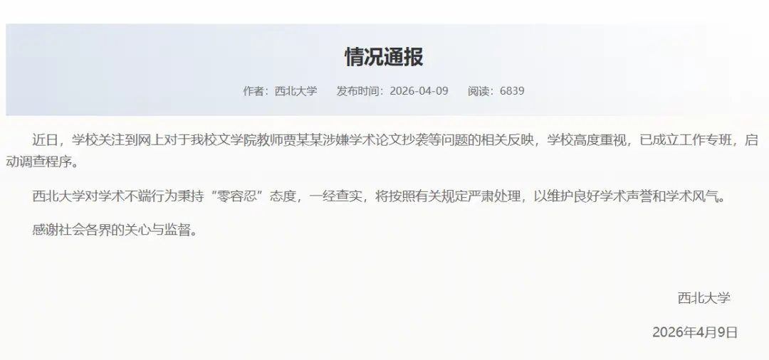 然而,今年4月9日西北大学发布的官方通报,却将争议从“审美趣味”推向了“学术底线”。通报指其文学院教师贾某某涉嫌学术论文抄袭,学校已成立工作专班调查。