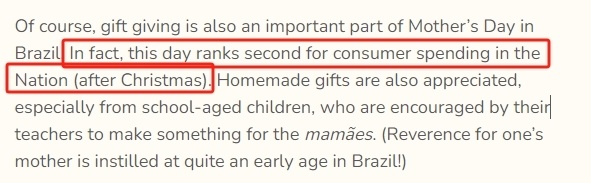 其实不然。巴西有点像“南美意大利”,很重视家庭,母亲节这天的消费额在他们的全年消费支出中排名第二,仅次于圣诞节。
