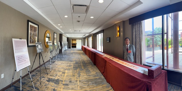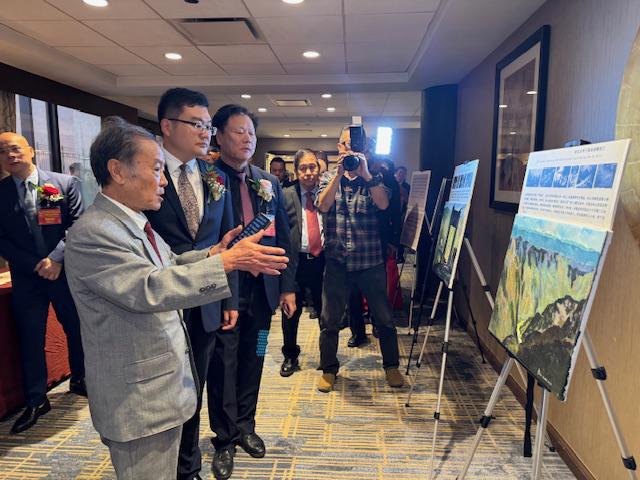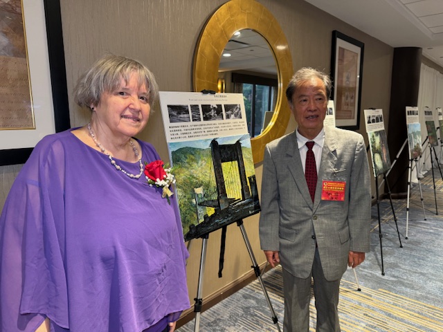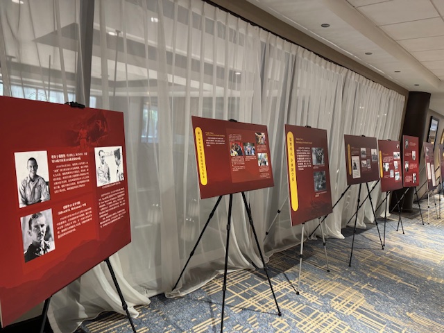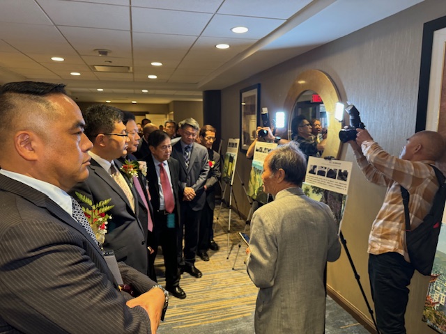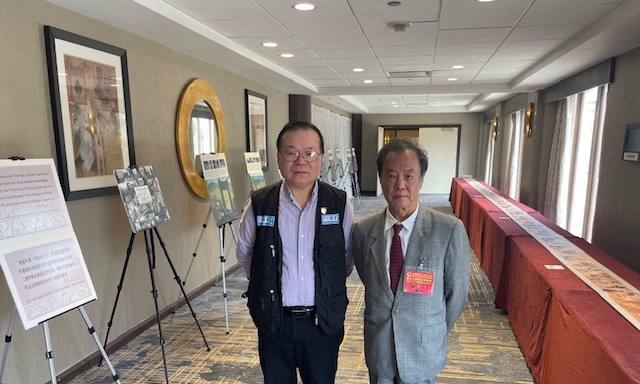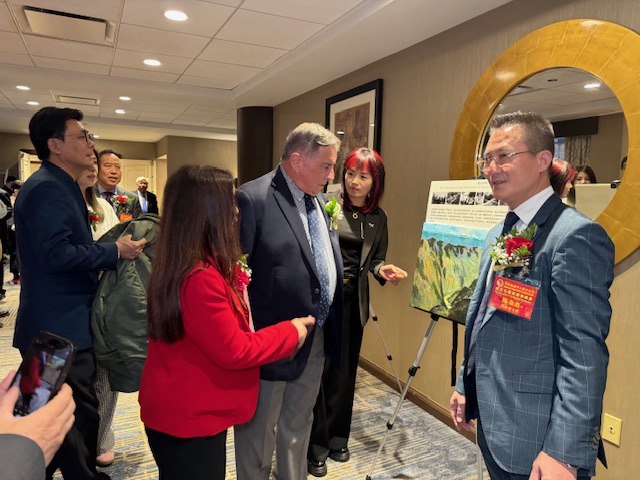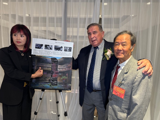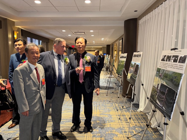 活动现场,美中航空遗产基金会主席杰弗里. 格林、中國駐紐約總領事館副总领事馬蕭蕭、美國福建華人聯合總會主席李華,著名國際友人穆言靈等数十位嘉宾与画家刘榕共同展开长卷合影。美中航空遗产基金会主席杰弗里. 格林对中国远征军滇西抗战遗址写生中的《风雨惠通桥》一画情有独钟,欣然与画家刘榕在画作前留影。