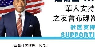 纽约华人支持亚当斯竞选市长连任之友会布碌仑7/27 "做势大会 "下午1:00. 8大道65街翠园酒家对面公园旁举行