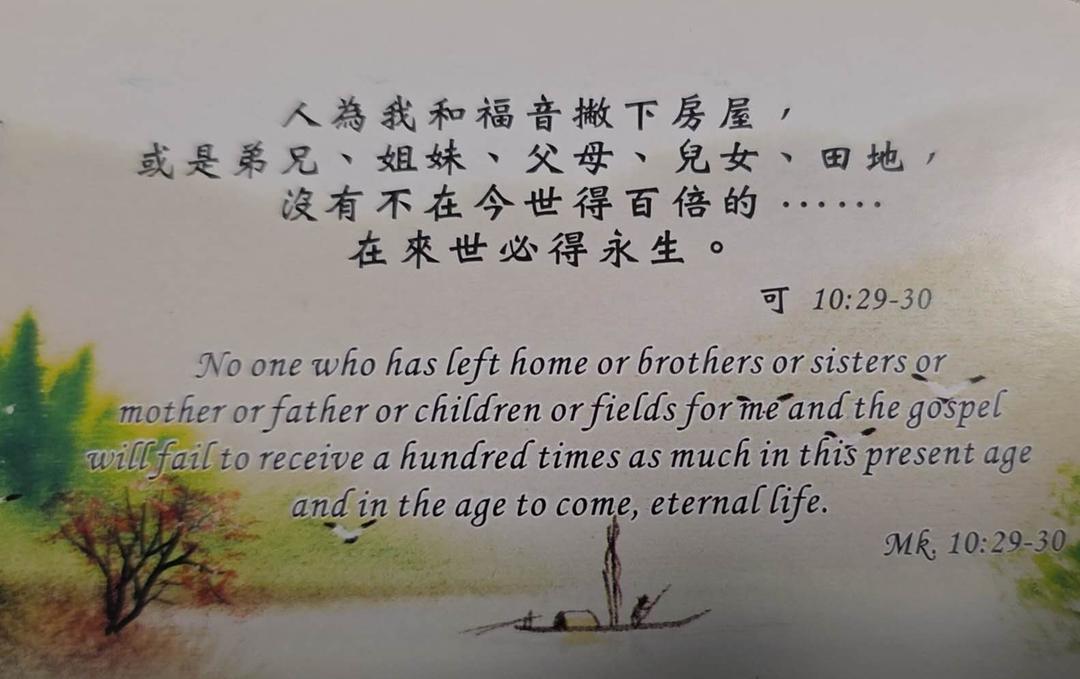 人為我和福音撇下房屋,或是弟兄、姊妹、父母、兒女、田地, 沒有不在今世得百倍的…….在來世必得永生。 ( 馬可福音 10:29-30 和合本 )