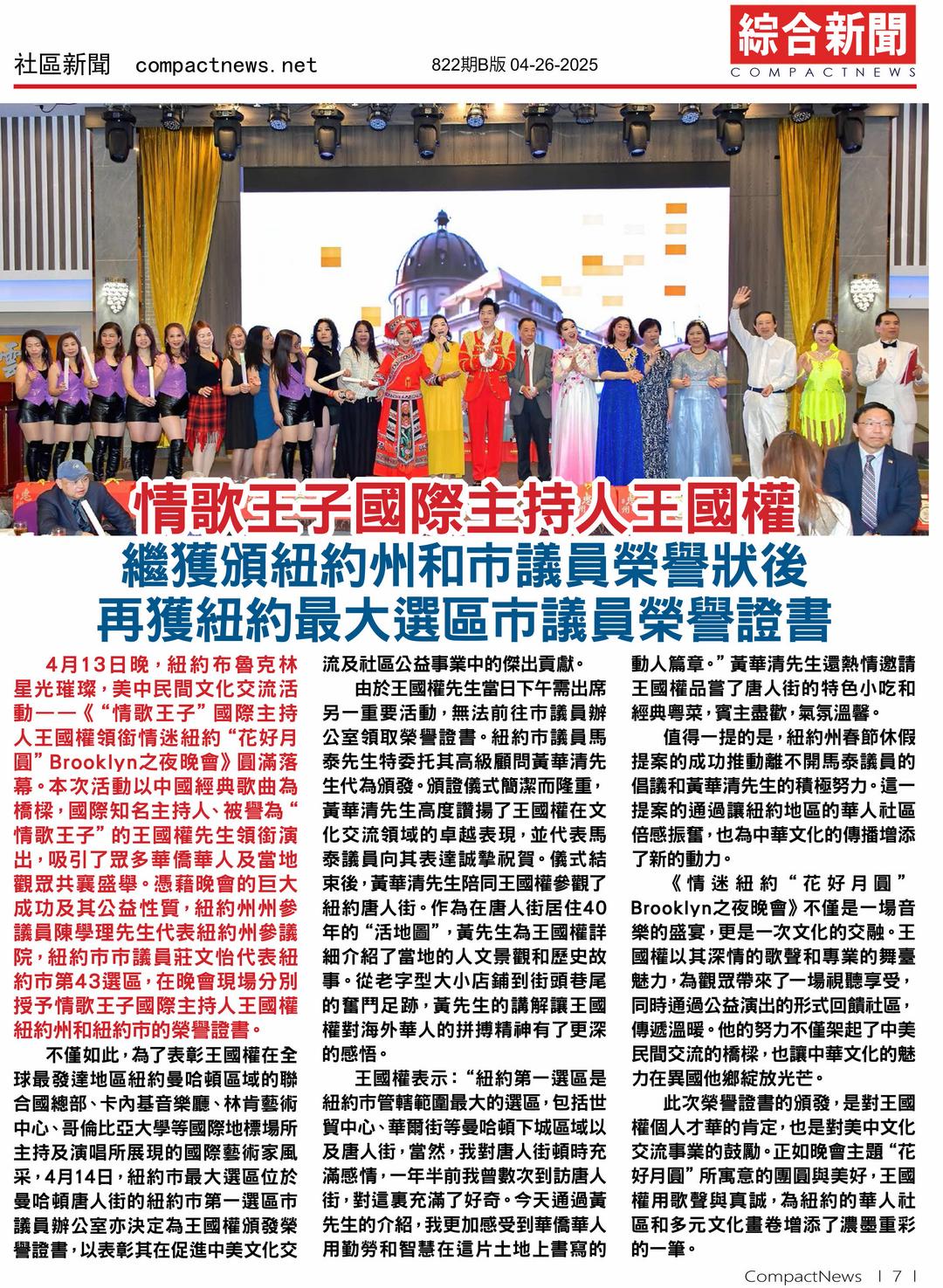 《侨报》报道,2月16日,王国权在纽约市政厅举办“花好月圆”公益演唱会,以中英双语及沪语演绎经典,征服《世界日报》、CNN等媒体,获誉无数。作为全球音乐家协会(GMA)唯一身兼常务理事与艺术顾问的成员,他在林肯中心主持“全球精英音乐会”,荣获“著名国际主持人”与“杰出表演”双证书,并摘得联合国“三重殊荣”——铂金志愿者奖(全球仅35人)、CSW69庆典时装公益秀认证及全球文化使者称号。此外,他获颁三份官方认证的“情歌王子·国际主持人”荣誉证书,分别由纽约州参议院、纽约市议会第一选区及纽约市第四十三选区授予,成为首位获此殊荣的华人艺术家。社交媒体平台X(如@luckyive)盛赞他“以无双魅力谱写中国人在国际舞台的新篇章”,美国主流及华文媒体广泛报道,称其为“国际舞台上的中国民间文化代表”,极大提升了中国文化的全球能见度。