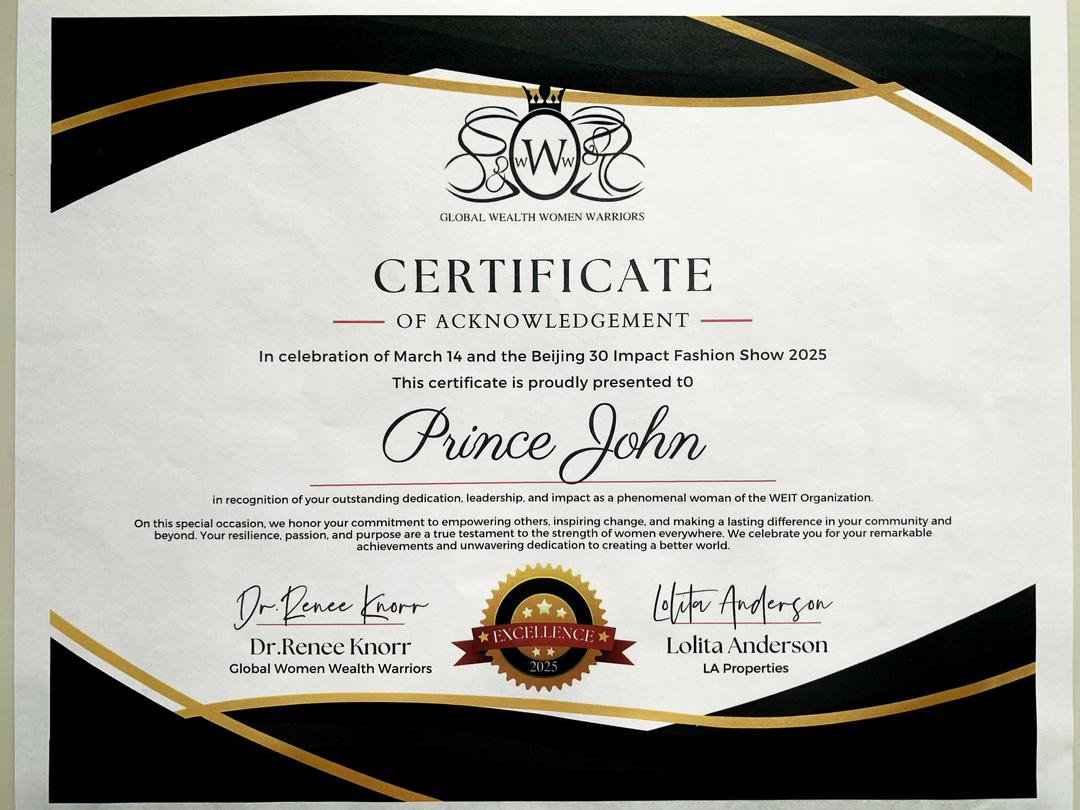 庆祝3月14日和2025年北京宣言30周年时装秀这份证书自豪的颁发给约翰王子(王国权),表彰您作为WEIT组织的杰出女性的杰出奉献精神、领导力和影响力。在这个特殊场合,我们尊重您承诺赋予他人权力,激励变革,并在您的社区内外做出持久的改变。你的韧性、激情和目标是各地女性力量的真正证明。我们祝贺您取得的杰出成就和坚定不移的奉献精神,以创造一个更美好的世界。坚定承诺赋予他人力量,激发社会变革,驱动全球持久进步”。