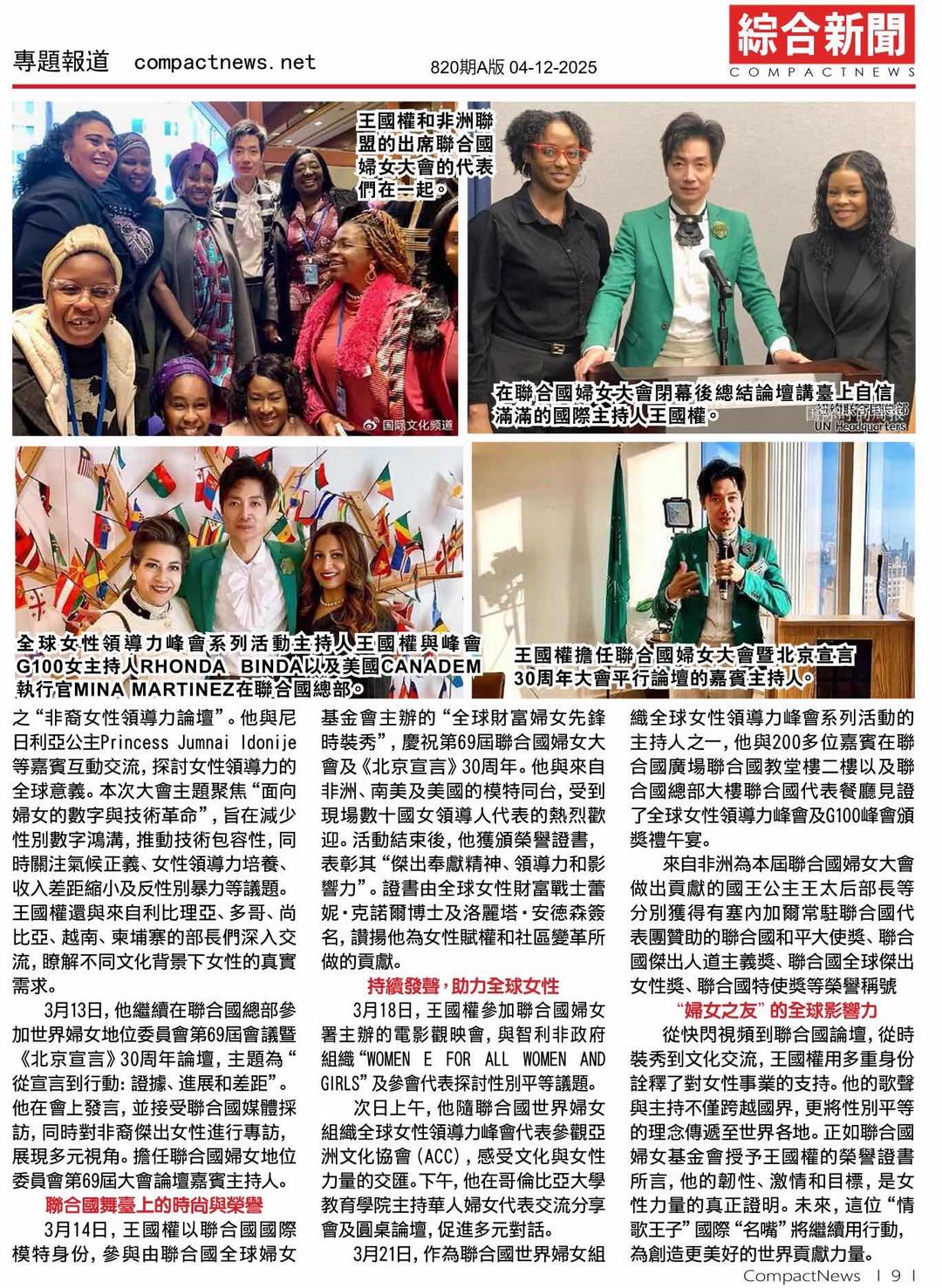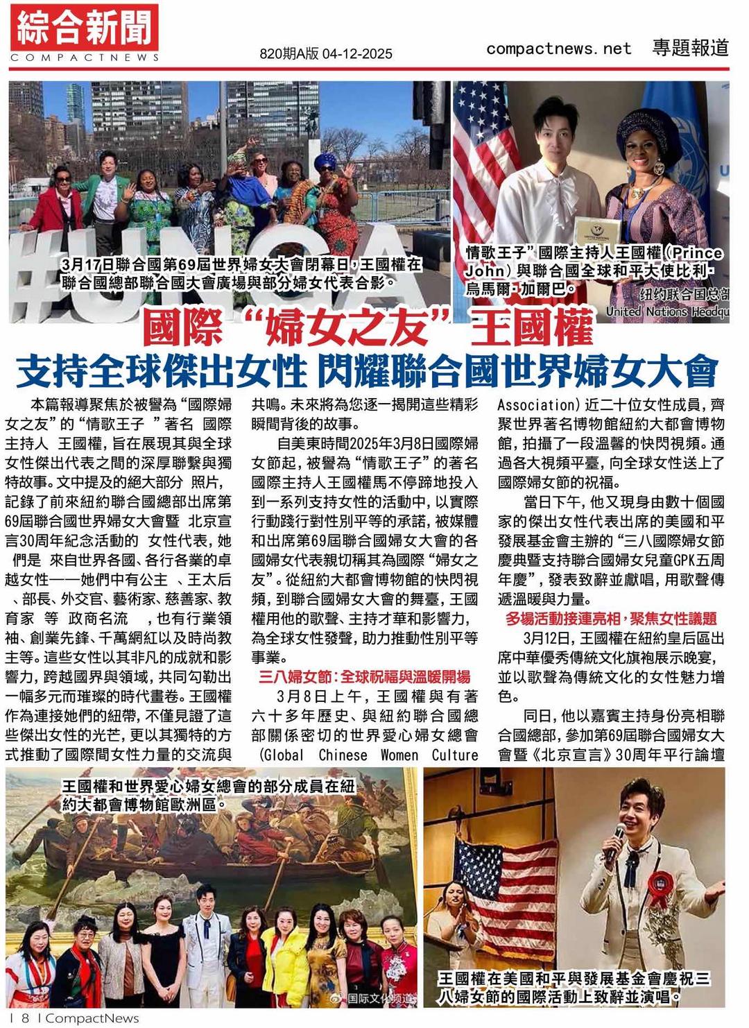 2025年3月26日,美国华文权威媒体《侨报》第B3版以恢弘篇幅率先礼赞中国籍国际主持人王国权(Prince John),这位被誉为“国际妇女之友”的“情歌王子”在第69届联合国妇女大会暨《北京宣言》30周年纪念论坛上,以卓越才华与深邃魅力书写历史新篇。4月12日,纽约《综合新闻》第820期以双整版专题进一步盛赞其成就。“国际妇女之友”王国权创下两项历史性“第一”:成为首位在联合国总部主持官方活动的中国籍主持人,以及首位在联合国妇女大会时装秀上献艺的中国人。这不仅是个人无上的荣光,更是中国文化自信在全球舞台的耀目绽放,彰显了中华文明在国际事务中的深远影响力与感召力。