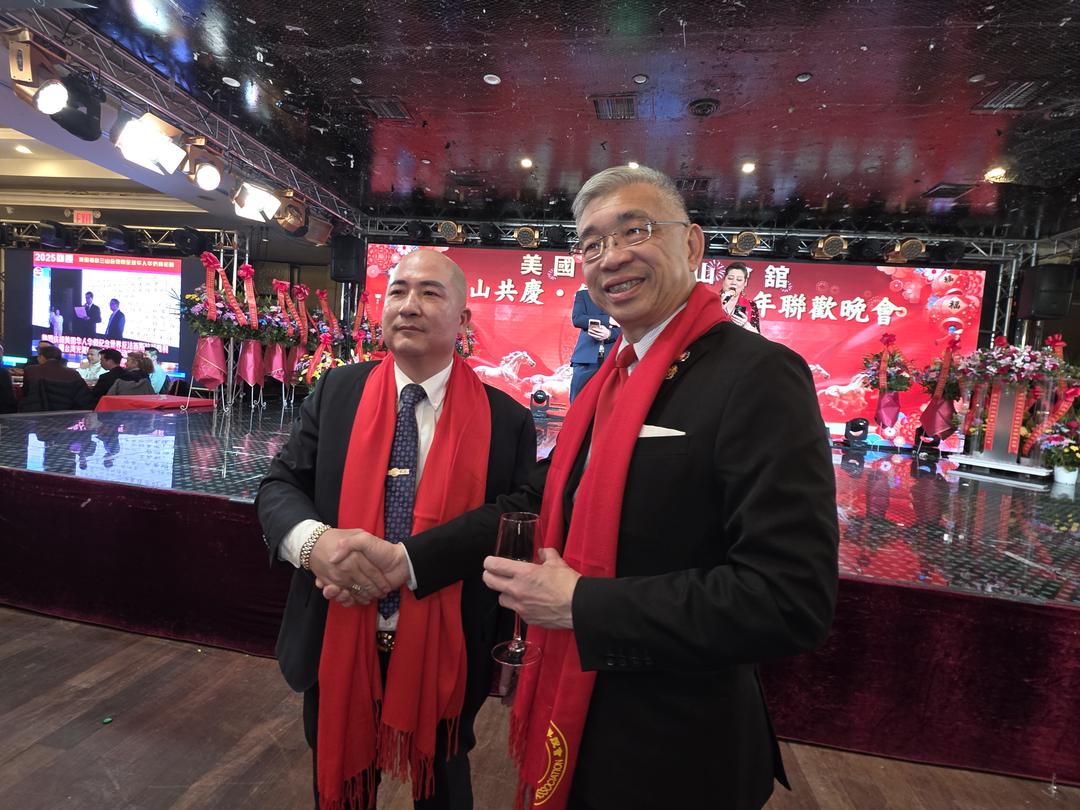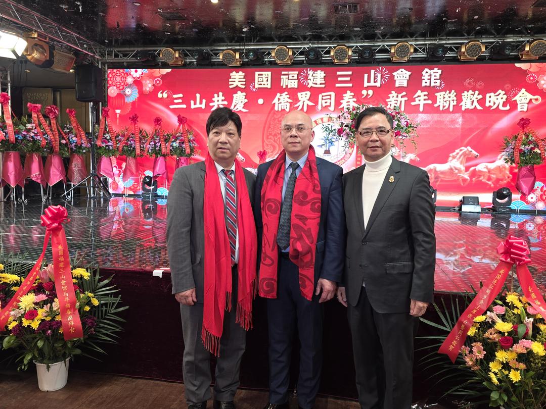 中國駐紐約總領事館領僑處主任潘焱在致辞时强调“今晚, 我受三山會館鄭振何主席的盛情邀請参加新春联欢晚会, 在这里我代表總領馆陳立總领事向侨胞们表示新春的祝福, 祝大家新春快乐,马年吉祥。回顾过去的一年, 福建三山会馆在郑振何主席的带领下取得了很多的成绩。热心服务、 并帮助受困难的乡亲,积极支持祖(籍)国和家乡的发展建设, 特别是积极组织了纪念中国人民抗日战争暨世界反法西斯战争胜利8 0周年的重大活动,我们一起迎接历史,开创未来。 非常恭喜福建三山会馆在去年購置会所, 我也很荣幸的参加了这个揭牌仪式。 大家一直在为中美关系平稳发展做出自己的贡献, 对福建三山会馆过去一年所取得的重要的成绩给予充分的肯定。 今年是马年,促使我们继往开来,一马当先,继续奋进。 在此我也祝美国福建三山会馆蒸蒸日上,也祝在座的各位新春快乐, 马到成功,马年吉祥!”