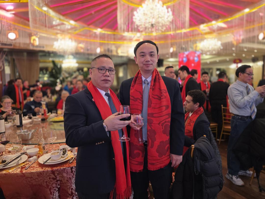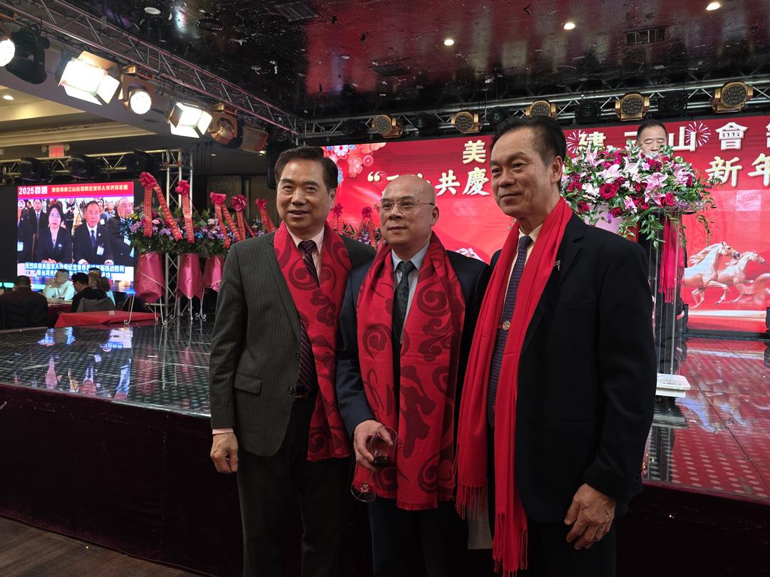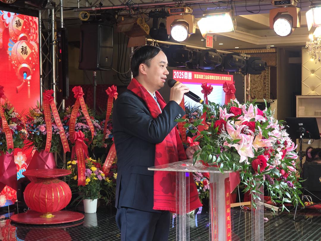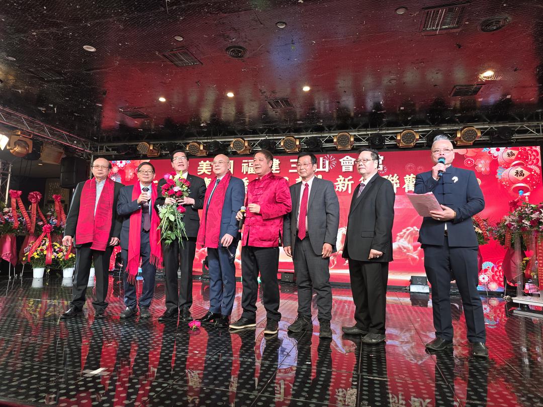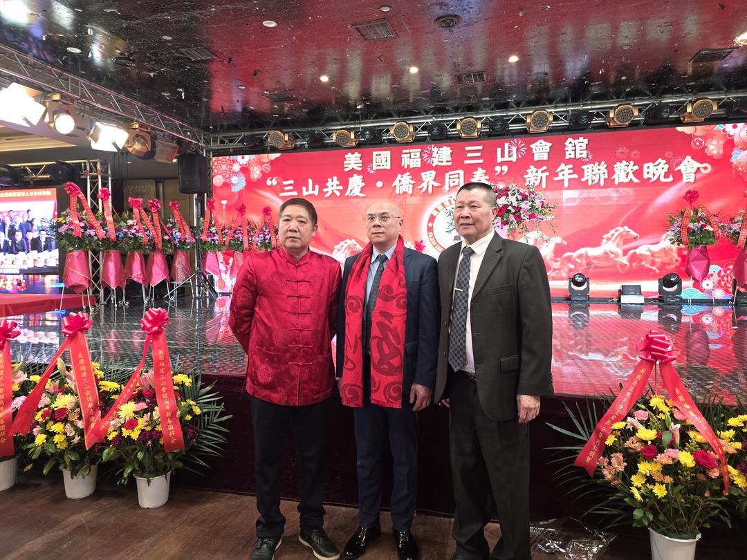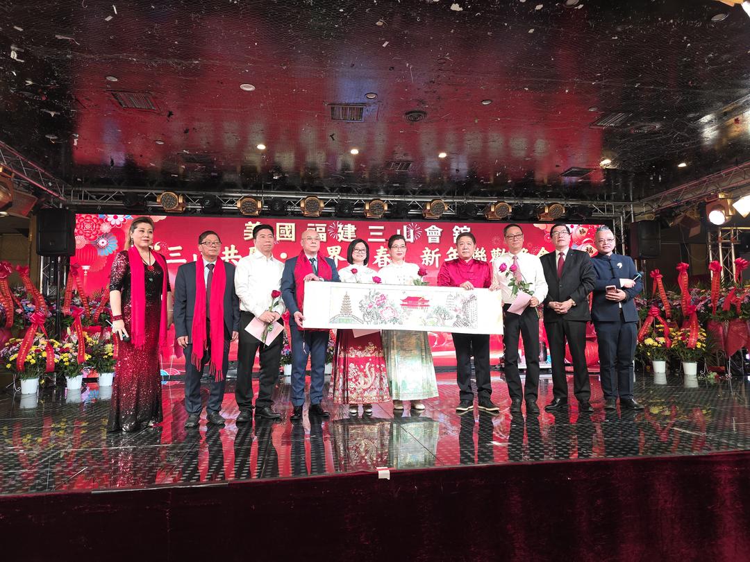 纽约州众议员郑永佳、市议员马泰、陈学理代表、 州参议员刘醇逸办公室代表和政界大佬顾雅明以及美国福建同乡会主 席陈恒、美国福建公所代主席林孔银、美国长乐公会主席卢建顺、 美国连江同乡会主席张云、美国福建华人联合总会主席李华、 美国福建四海商会主席董胜等先后致词, 向三山会馆表示热烈的祝贺和新春的祝福。