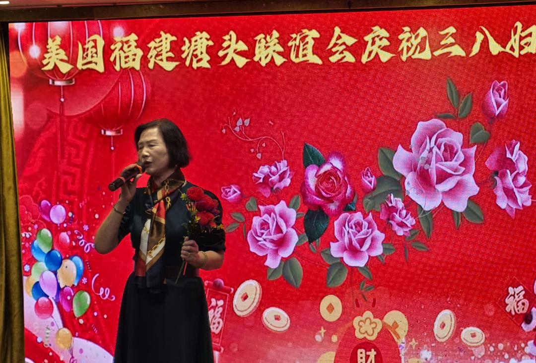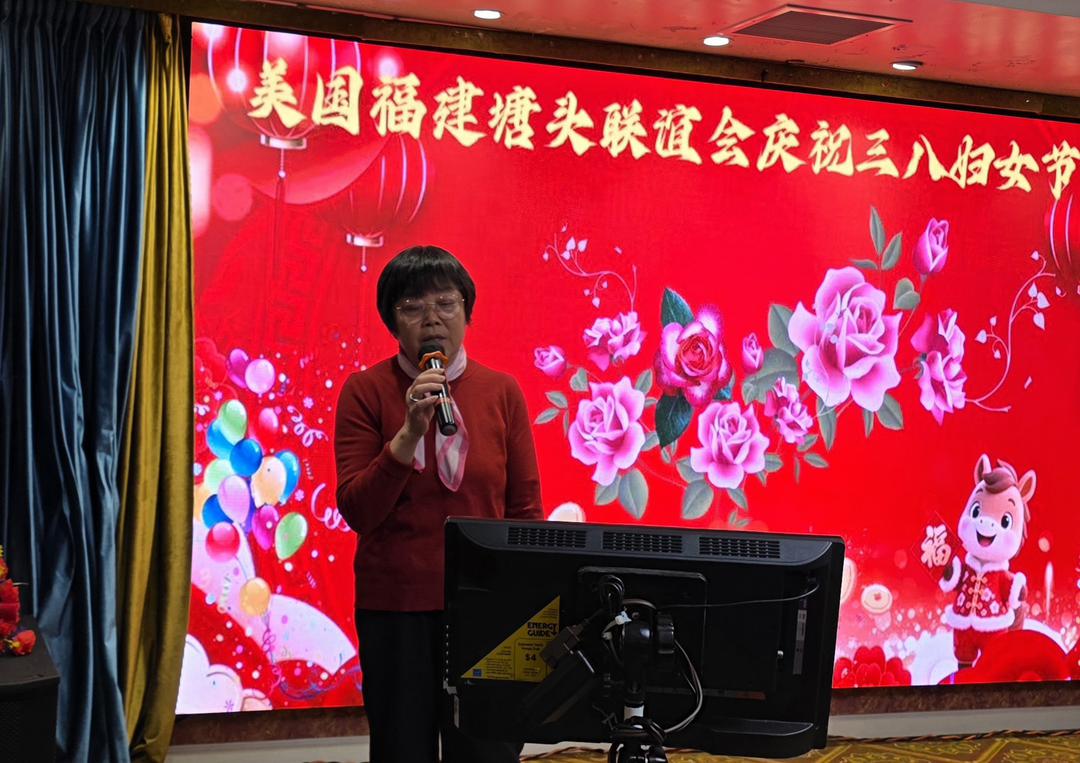 美国福建塘頭聯谊會妇女會會長鄭賽嬌表示: 丙午马年举办慶祝國際三八婦女節聚会, 特别感谢联谊会在慶祝國際三八妇女节之际,精心组织了联谊活动, 得到了乡亲妇女们的积极响应。才有今天这么热闹的场面, 大家歌舞歡聚一堂的精彩节目。希望每年都举办这样的活动、 加深感情、为塘頭乡亲做点贡献.