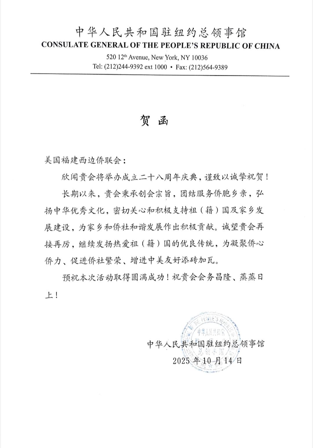 青年会会长郑新宣读中国驻纽约总领馆贺函: