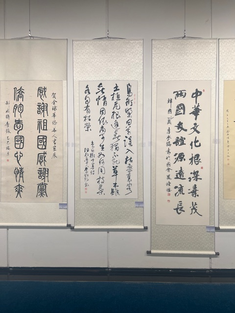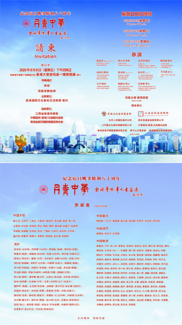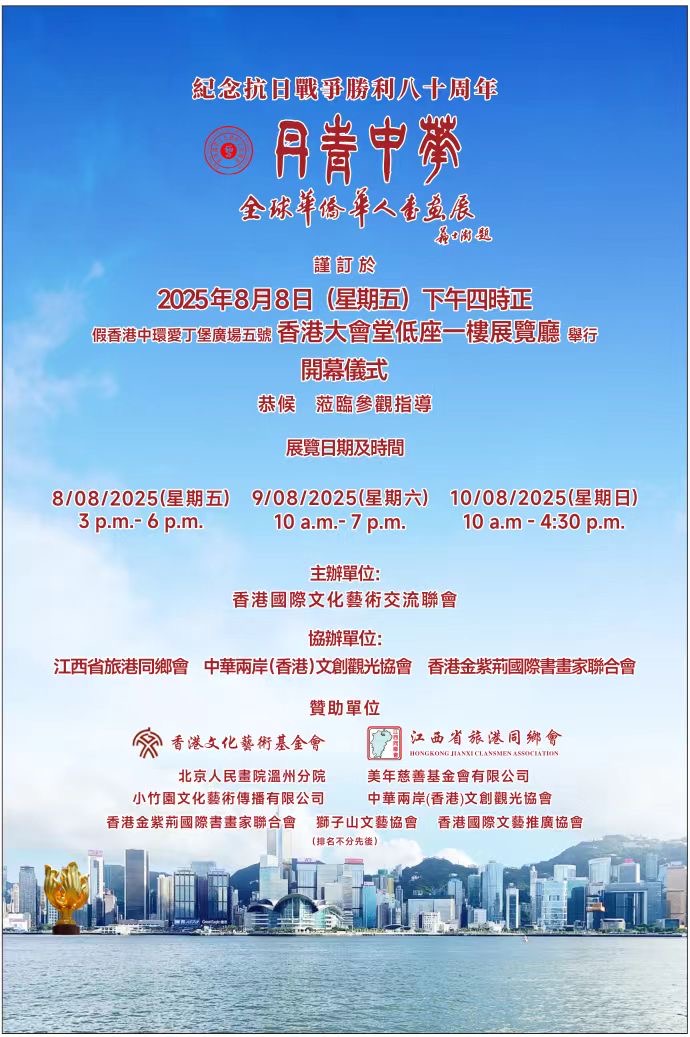 由香港國際文化藝術交流聯會主辦,江西省旅港同鄉會、中華兩岸(香港)文創觀光協會、香港金紫荊國際書畫家聯合會協辦的紀念抗日戰爭勝利80週年“丹青中華·全球華僑華人書畫展”於8月8日在香港大會堂举行开展仪式。香港特区立法会前主席、大紫荆勋章获得者曾钰成,多名港区全国政协委员、特区立法会议员、香港中联办代表等出席,來自多個國家的華僑華人、兩岸和港澳人士200多人参加。港区全国政协常委、中国和平统一促进会香港总会会长姚志胜题词致贺,第十三届全国政协常委、原中国书法家协会会长苏士澍题写展标,天津市归国华侨联合会发来贺信。