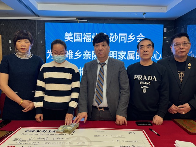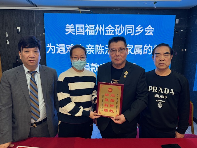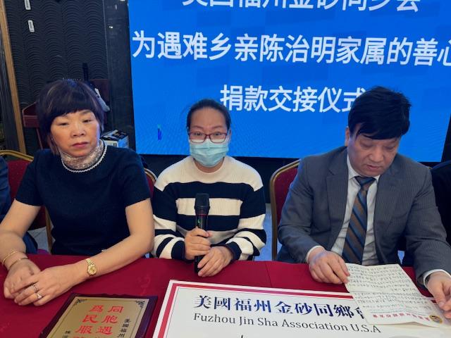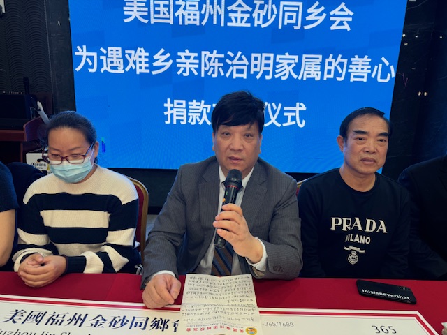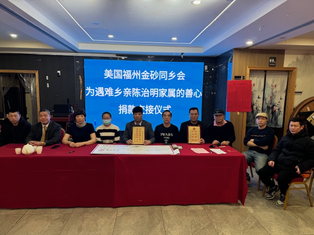 12月6日,美国福州金砂同乡会为遇難乡親陳治明家属的善心捐款交接仪式在布碌侖举行。參加今天下午发布会有美國金砂同鄉會執行主席陳治德、主要骨干陳治敏、陳治华、陳學其、陳善楚、陳學東、陳玉鳳、陳兰、陳方武、陳燕芝、陳松、李以增、陳叶青、陳秀萍、陳善焰、陳善榕、美國亞總會主席陳善庄、美国琅岐联合总会會長江富春、执行会长江常流等。將善款交給胞姐手中。交接儀式由陳治華主持。