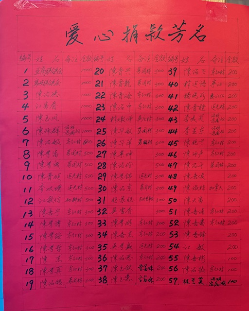 今天在这里我无法详细念出每一位爱心捐款者的芳名 ,无法详细剖释每项善款的分量。但每一分钱都承载着大家的功德和祝福。都会详细入帐上册,作为永久的感恩。我相信每个人的点滴付出都会在自已人生的旅途中留下美好的记忆. 也体现了对乡亲的赤诚情怀。