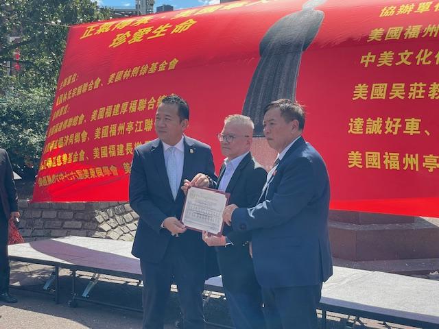 纽约州众议员郑永佳代表陈键榕致词:今天我很榮幸能代表紐約州眾議員鄭永佳(Lester Chang),出席美國華人華僑紀念林則徐誕辰240週年大會,並代為頒發這份由紐約州議會頒贈的表揚狀。
