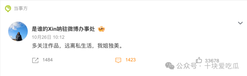 10月26日,辛芷蕾助理账号发文,称“多关注作品,远离私生活,我姐独美”,疑似确认分手传闻,评论区的粉丝很激动,纷纷庆祝终于分手了。