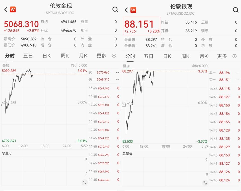 截至发稿,现货黄金涨至5068.31美元/盎司,涨幅2.57%;现货白银涨至88.151美元/盎司,涨幅3.20%。
