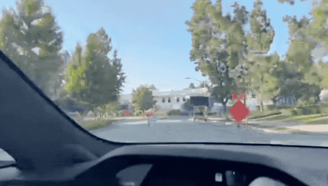 大约5分钟时,车辆又碰上一片减速带,Model S顺利完成自动减速。与此同时,一辆自行车在右侧飞速前进,但丝毫不会对它造成影响。