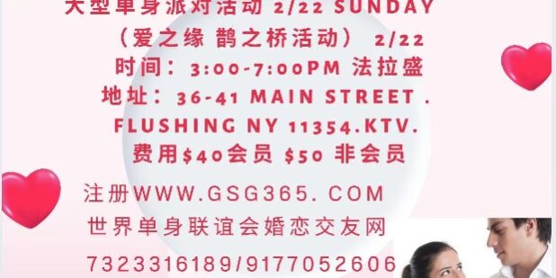 世界单身联谊会主办.欢迎参加. 联系电话7326662066/ 7323316189. address: 36-41 Main Street . Flushing NY 11354. register www.gsg365.com